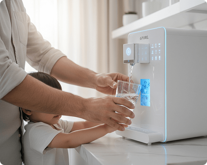 Trostruki sistem filtracije (CF + PAC + RO) uklanja fizičke čestice, hemikalije, klor, mirise, teške metale, pesticide, nitrate, mikroplastiku, bakterije i viruse. Srce sistema je RO membrana, ista tehnologija koja se koristi u medicinskim i laboratorijskim uređajima. Rezultat je voda izuzetne čistoće — mekša, osvežavajuća i bez kamenca. Uređaji poput kuvala, aparata za kafu i espresa traju duže jer se u njima više ne taloži kamenac.